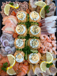 mooie schaal met zalmspijs ,ger.paling, ger.zalmfilet, haring ,brado, ger.makreelfilet, Hollandse garnalen